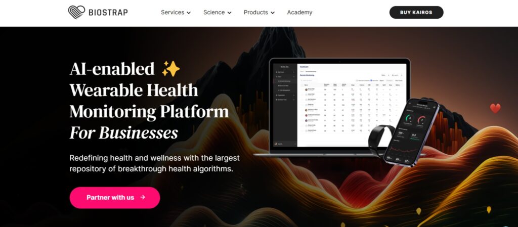 High-fidelity biosignals recorded by Biostrap biosensors are transferred to an Android/iOS mobile app via Bluetooth and stored in Biostrap cloud servers for data processing. Processed data is then delivered back to the mobile app and remote physiological monitoring (RPM) web dashboard for analysis.