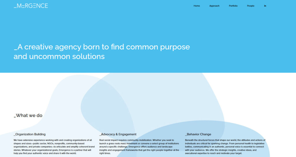 They seamlessly integrate deep subject-matter expertise with strategy and design. By bringing the tools of advertising, marketing, and communications to bear on their most pressing problems, Emergence helps a wide variety of social impact organizations engage audiences and influence behavior.